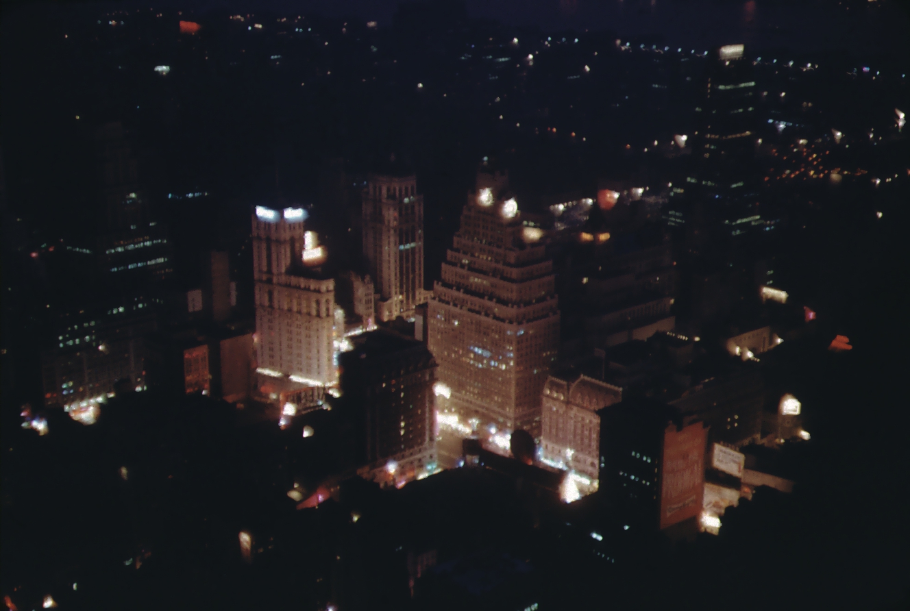 Manhattan skyline at night, circa 1955